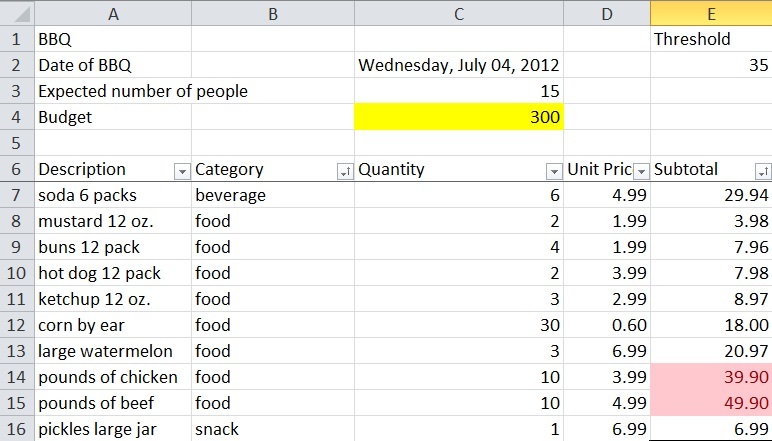 Conditional formatting formats cells according to specific conditions. It enables the user to quickly identify variances in a range of cells with a quick glance. For example, cells more than $35 are highlighted in spreadsheet below.